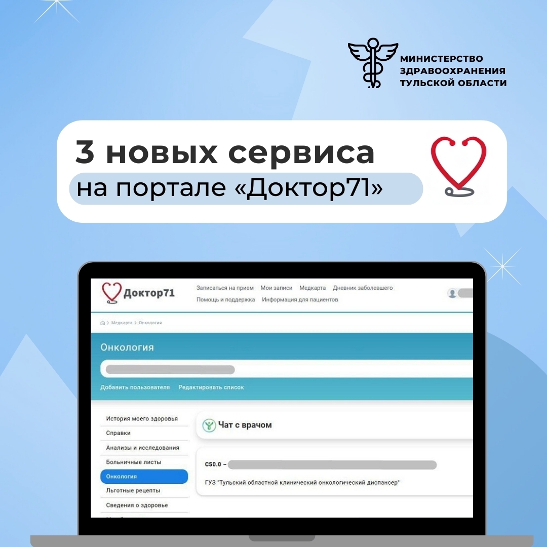 Электронный сервис «Доктор 71» позволяет жителям следить за своим здоровьем и получать необходимую медицинскую информацию в любое время. В этом году минздрав расширил его функционал: жителям стали доступны онлайн-консультации с врачом, кабинет онкопациента и раздел «Онко-здоровье».