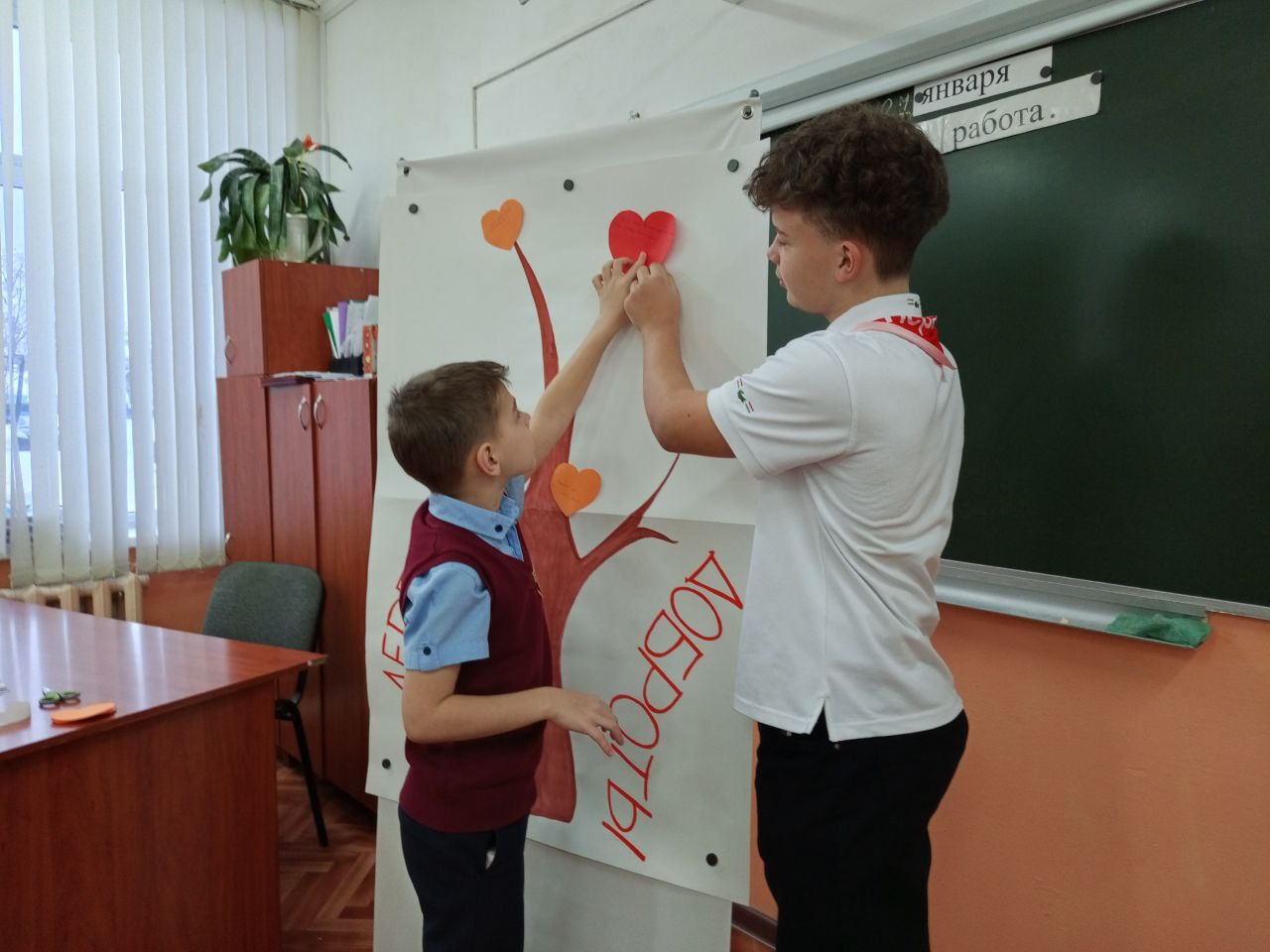 В конце классного часа ребята сделали сердца из цветной бумаги, написали на них пожелания мира и добра, а затем украсили ими символическое Дерево доброты.