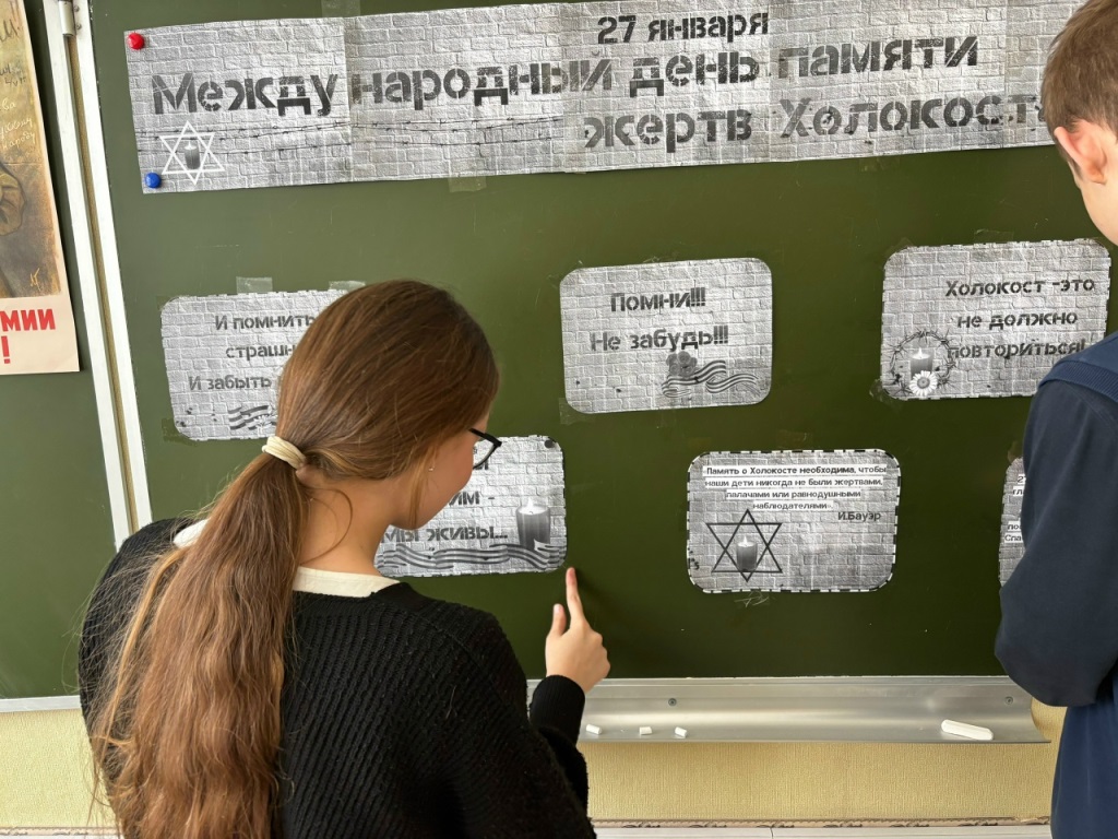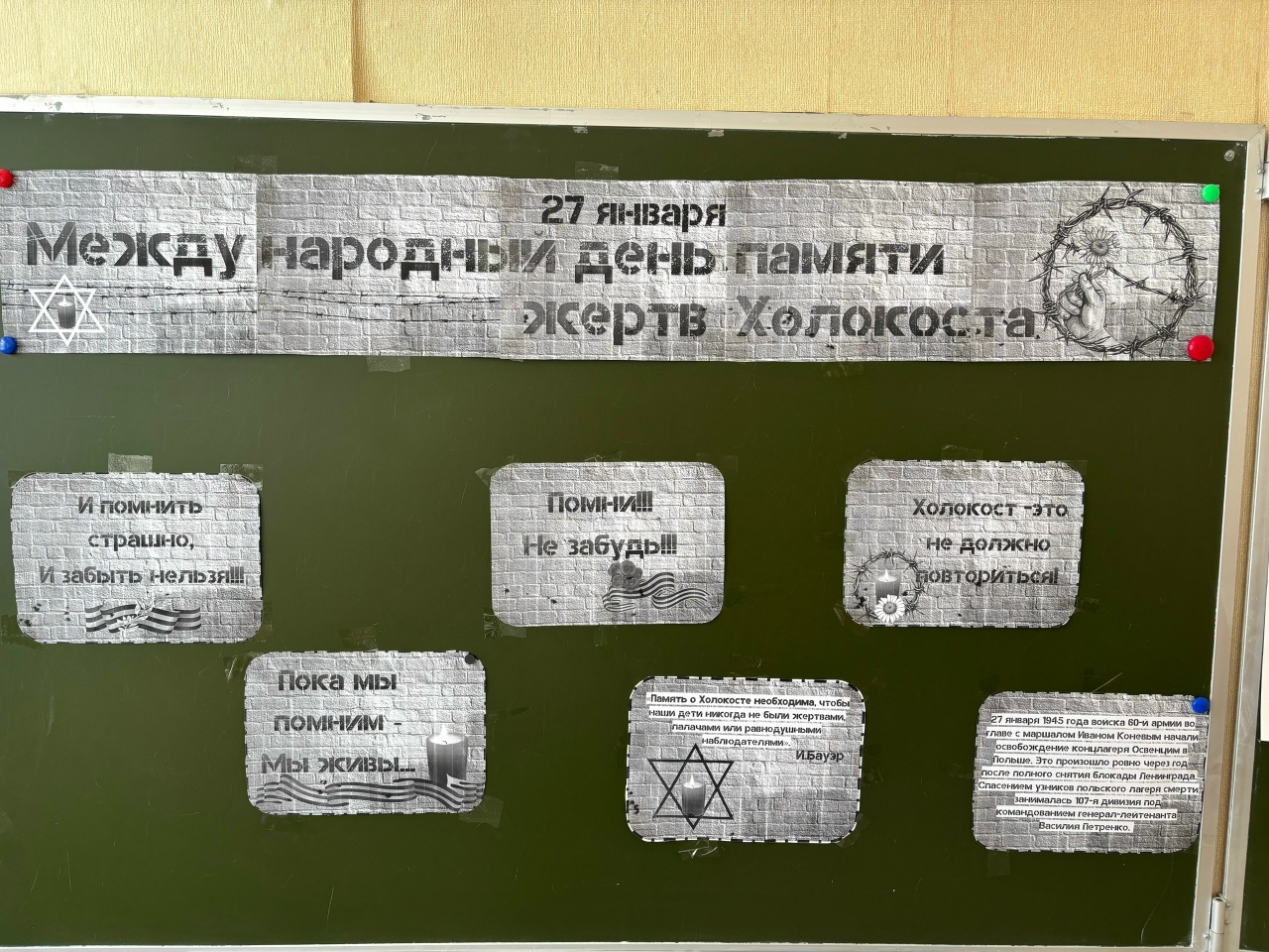 «Стена памяти» в Советской школе № 2 была создана к Международному дню памяти жертв Холокоста на основе фотографий, документов и личных историй, которые напоминают нам о днях освобождения Красной Армией крупнейшего «лагеря смерти» Аушвиц-Биркенау (Освенцима).