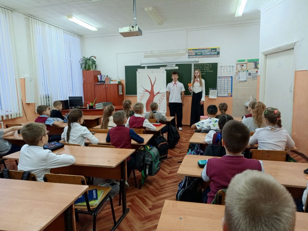 В конце классного часа ребята сделали сердца из цветной бумаги, написали на них пожелания мира и добра, а затем украсили ими символическое Дерево доброты.