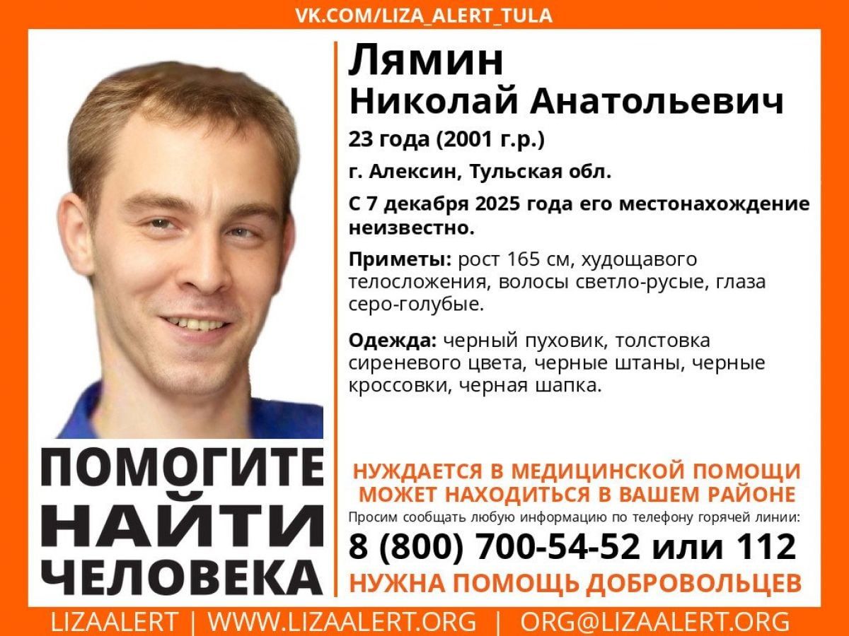 Приметы: рост 165 см, худощавое телосложение, светло-русые волосы, серо-голубые глаза. Был одет: черный пуховик, сиреневая толстовка, черные штаны, кроссовки и шапка.