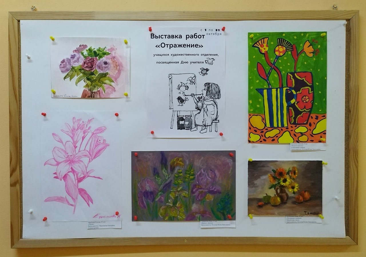 В Первомайской детской школе искусств открылась выставка работ учащихся художественного отделения «Отражение». Она подготовлена к грядущему Дню учителя.