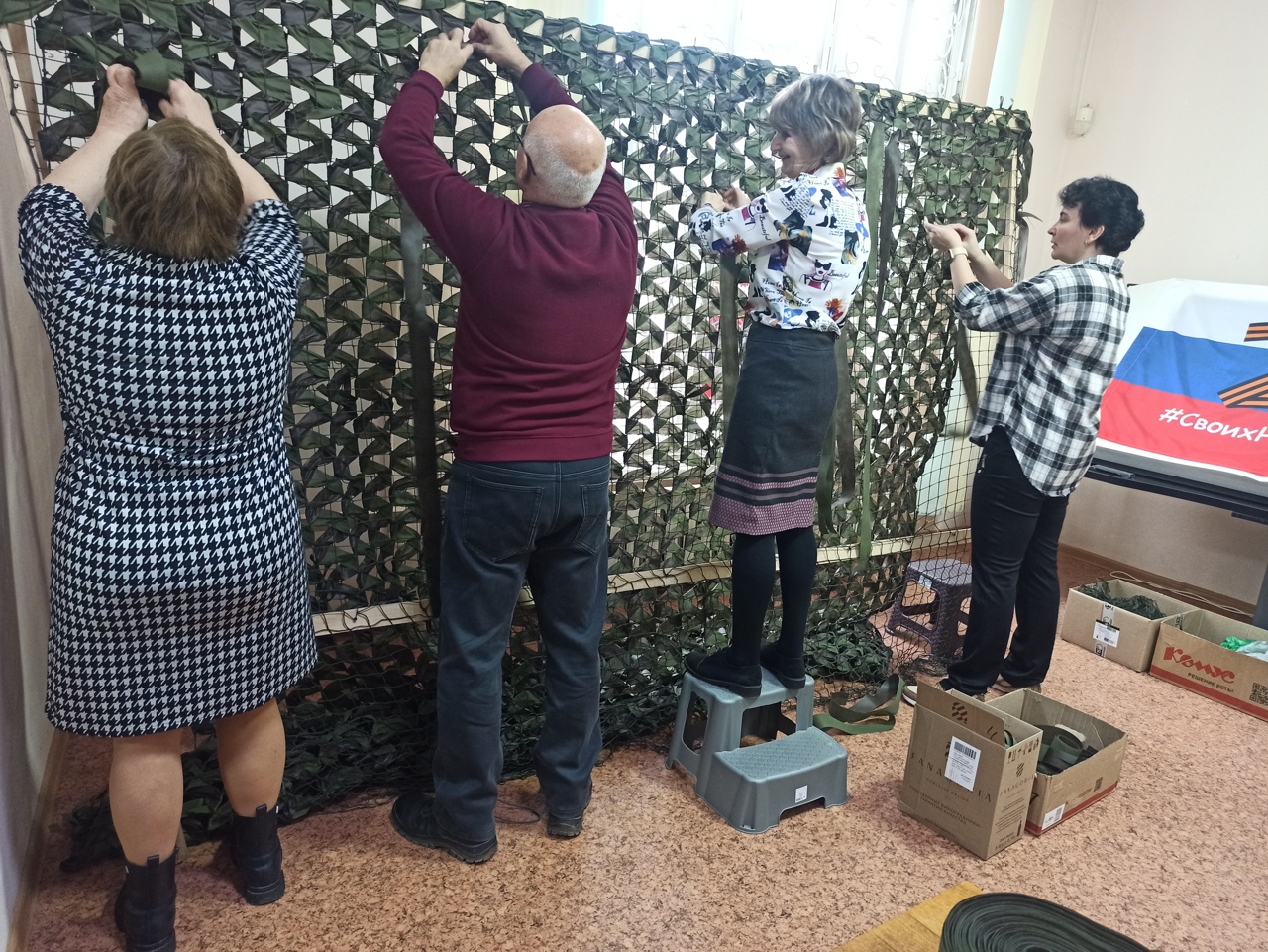 Осуществлялись и завершающие операции со сшитыми в домашних условиях предметами мужского нижнего белья - вставка бельевой резинки и маркировка. Вязальщицы продолжили работу над изготовлением теплых шерстяных носков. Завершена работа по плетению 21-й по счету маскировочной сети.