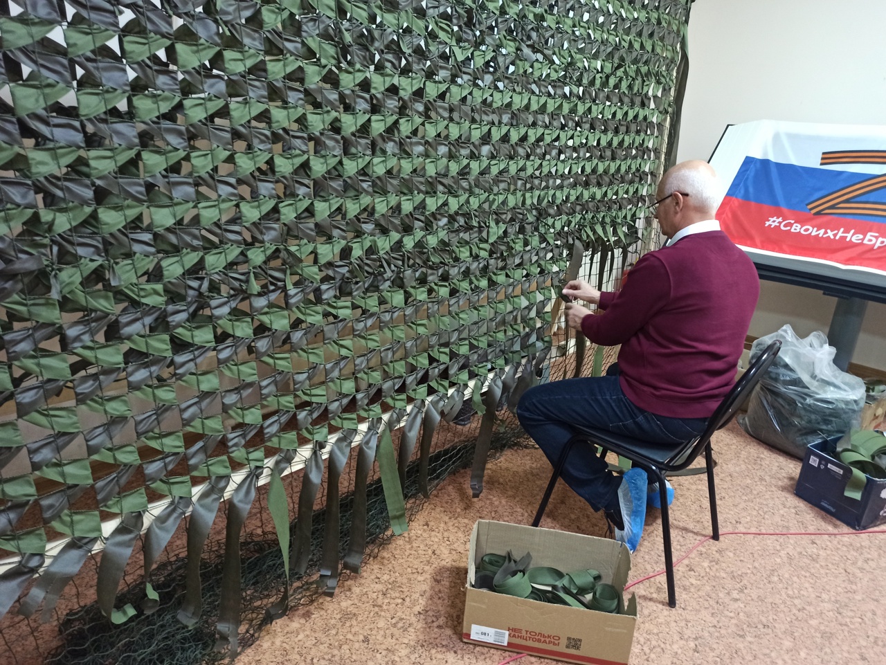 В ходе плодотворной работы участники плели маскировочные сети, резали ленты для изготовления маскировочных накидок и готовили ветошь к упаковке. Были подготовлены к пошиву детали для 50 изделий, а в 40 уже сшитых изделий вставлена бельевая резинка.