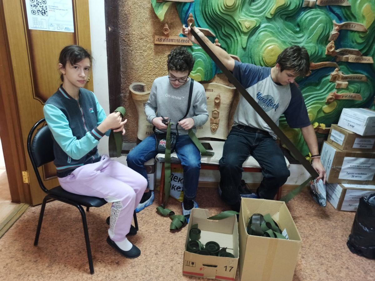 частники детского клуба продолжают резать специальные ленты, которые взрослые мастерицы из клуба вязальщиц «Территория заботы» используют для плетения прочных и надежных маскировочных сетей.