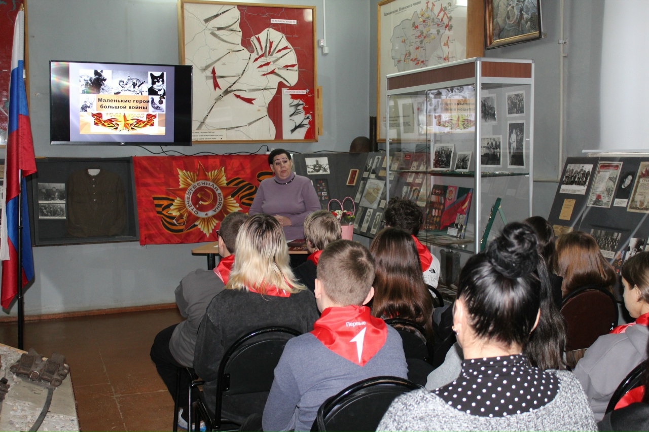 Сотрудники Мемориального музея Н.И. Белобородова рассказали учащимся 8 класса Средней школы №9 о службе собак-санитаров, лошадей, голубей и других верных помощников фронта, чья самоотверженность спасала тысячи человеческих жизней, а также подчеркнули роль животных в боевых действиях и представили информацию о памятниках, воздвигнутых в честь этих бескорыстных соратников.