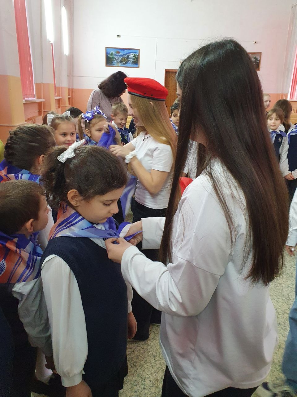 Советник директора по воспитанию рассказала легенду «Орлят». А наставники - старшеклассники, активисты ученического самоуправления, завязали галстуки ребятам.