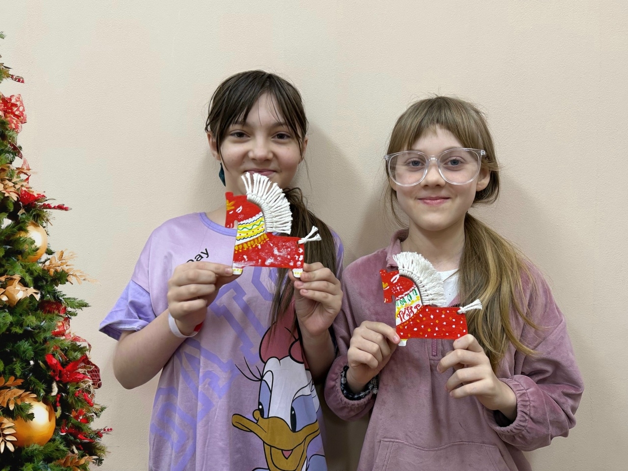 Используя яркие акриловые краски и белую веревку, девочки превратили деревянные заготовки в прекрасных лошадей - символов наступающего Нового года.